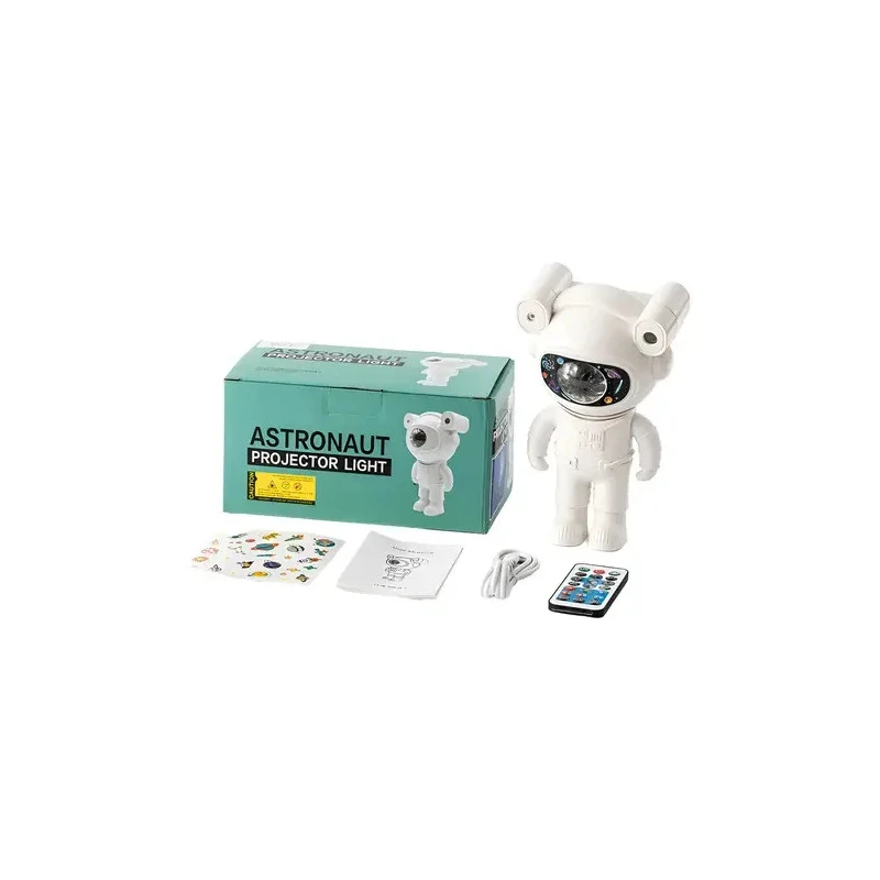 This astronaut-shaped projector is a functional addition to B2B catalogs focused on decorative lighting and tech gifts. Its complete packaging and included accessories facilitate product rotation on physical shelves and in e-commerce stores.