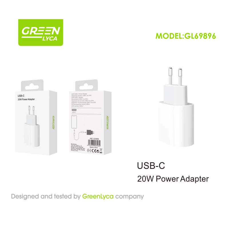 El adaptador de corriente GreenLyca GL69896 combina eficiencia energética y un diseño funcional para cubrir las necesidades actuales de carga móvil. Es un componente esencial para cualquier catálogo de electrónica de consumo que priorice la compatibilidad USB-C.