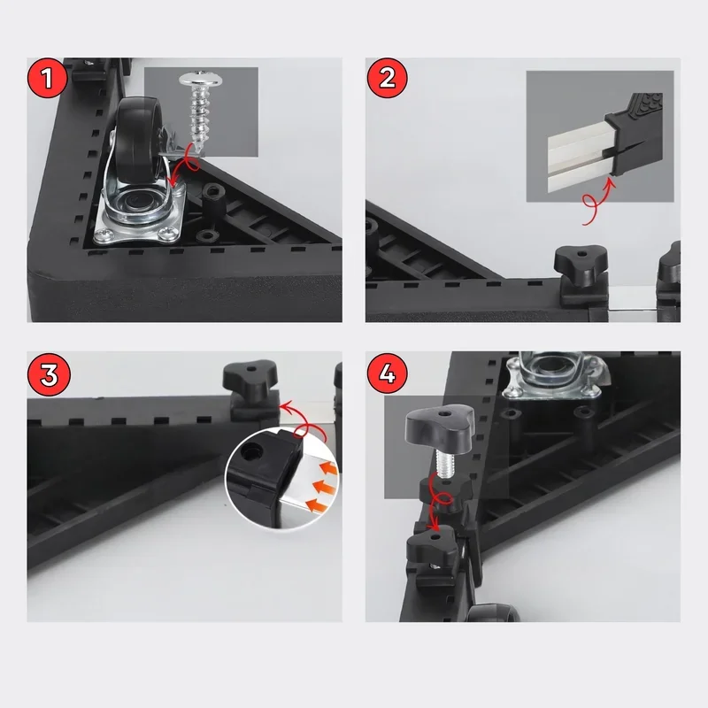Cette base facilite le déplacement d'équipements lourds tels que des machines à laver et des réfrigérateurs, permettant une mobilité aisée pour les tâches de nettoyage ou de maintenance technique.