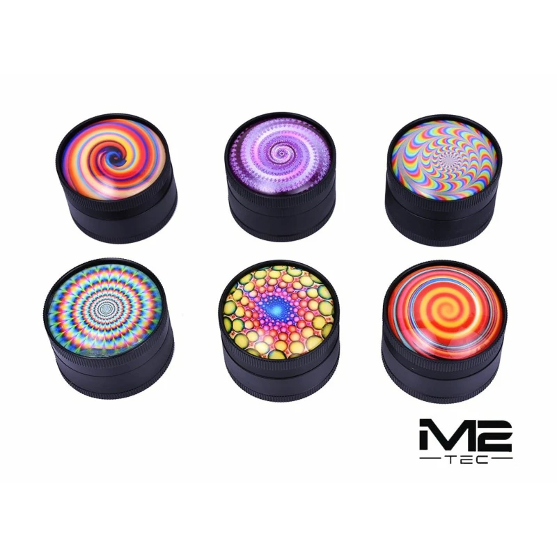 A tampa superior apresenta padrões psicodélicos e mandalas protegidos por uma lente transparente. O acabamento preto fosco do corpo metálico proporciona um contraste visual marcante.